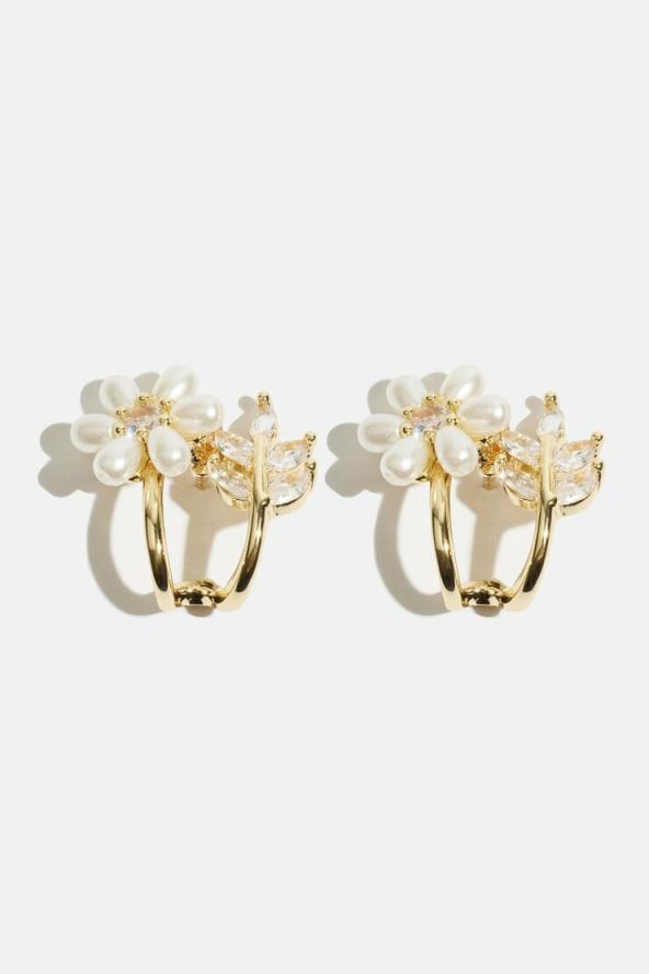 For a dainty look. Features Gemstone and faux-pearl floral detailing Open back Bullet back with stopper Size Drop: 10mm Materials 70% brass, 15% acrylic, 10% cubic zirconia, 5% iron Imported