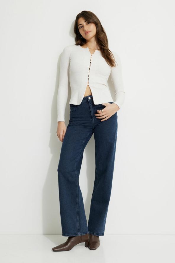 This cardigan is made from a soft rib knit fabric with a thick handfeel, designed to have a fitted silhouette. Wear it with one of our best-selling jeans . Features Crewneck Button closure Size & Fit Fitted Stretch fabric Sizing: This style runs large. Size down for a perfect fit. Materials & Care 92% rayon, 8% spandex Machine wash, cold Imported